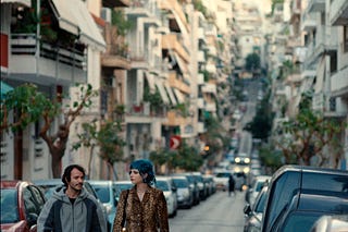 Jovens estilosos de cabelos coloridos que vagam por uma Atenas fantasmagórica